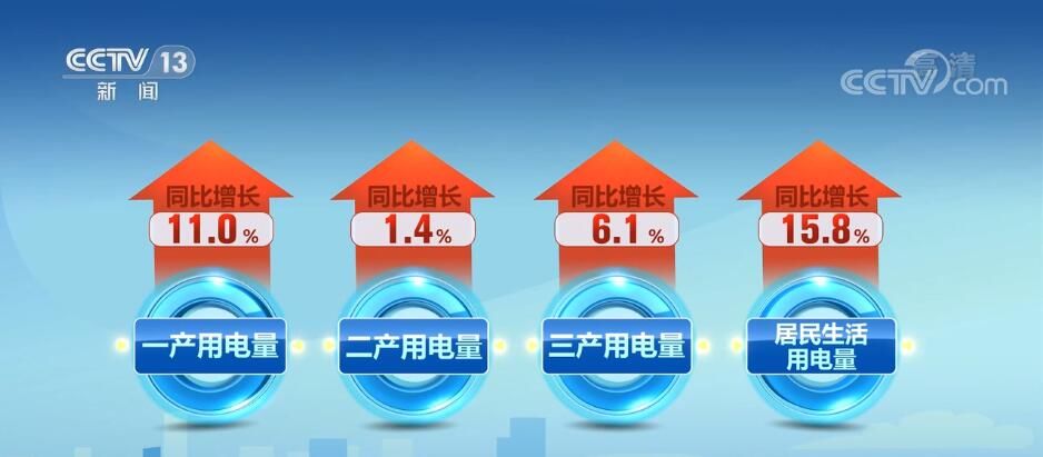 从用电情况看,1—8月,全社会用电量同比增长4.4%,其中,一产、二产、三产和居民生活用电量同比分别增长11.0%、1.4%、6.1%和15.8%;8月份,全社会用电量同比增长10.7%。